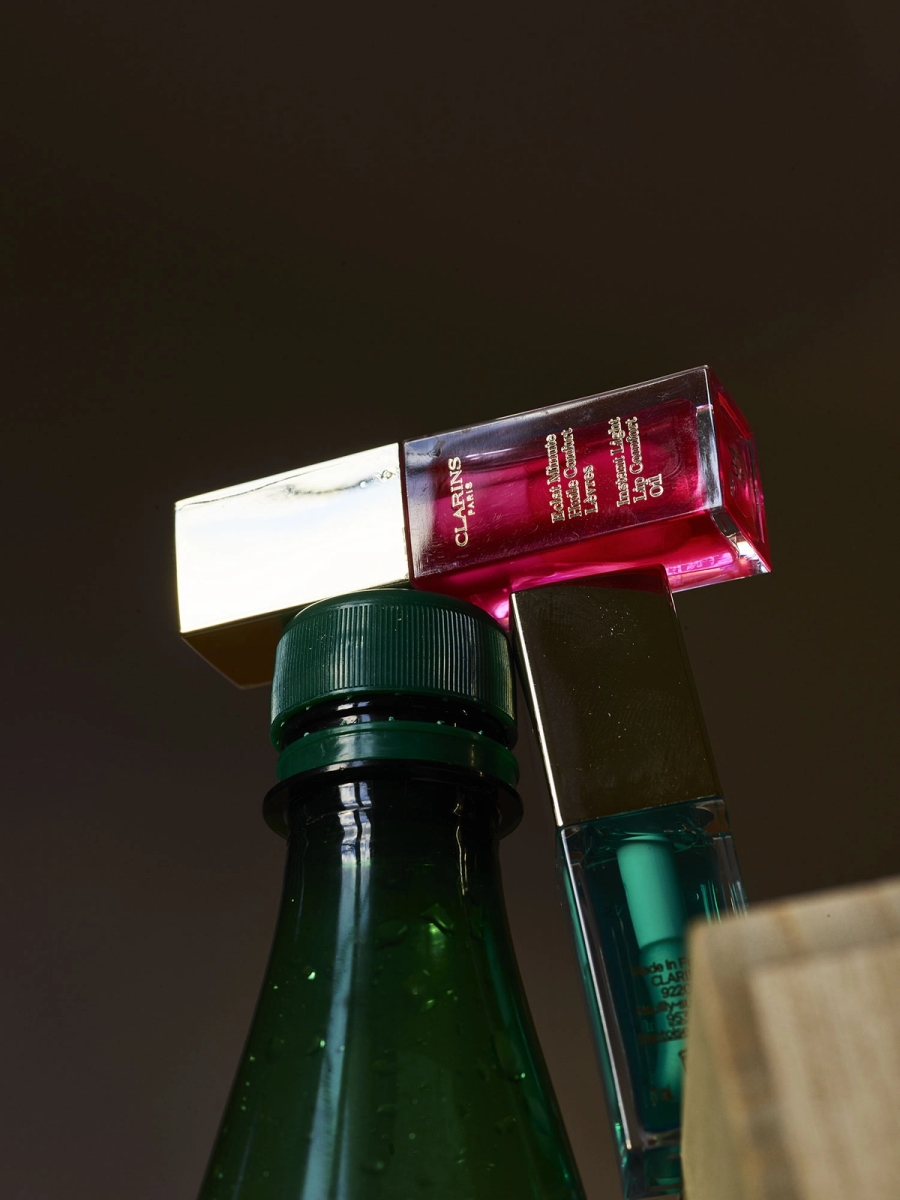 LEFT Clarins, Éclat minute huile confort lèvres 04 candy, RIGHT Prada, L’Homme l’Eau